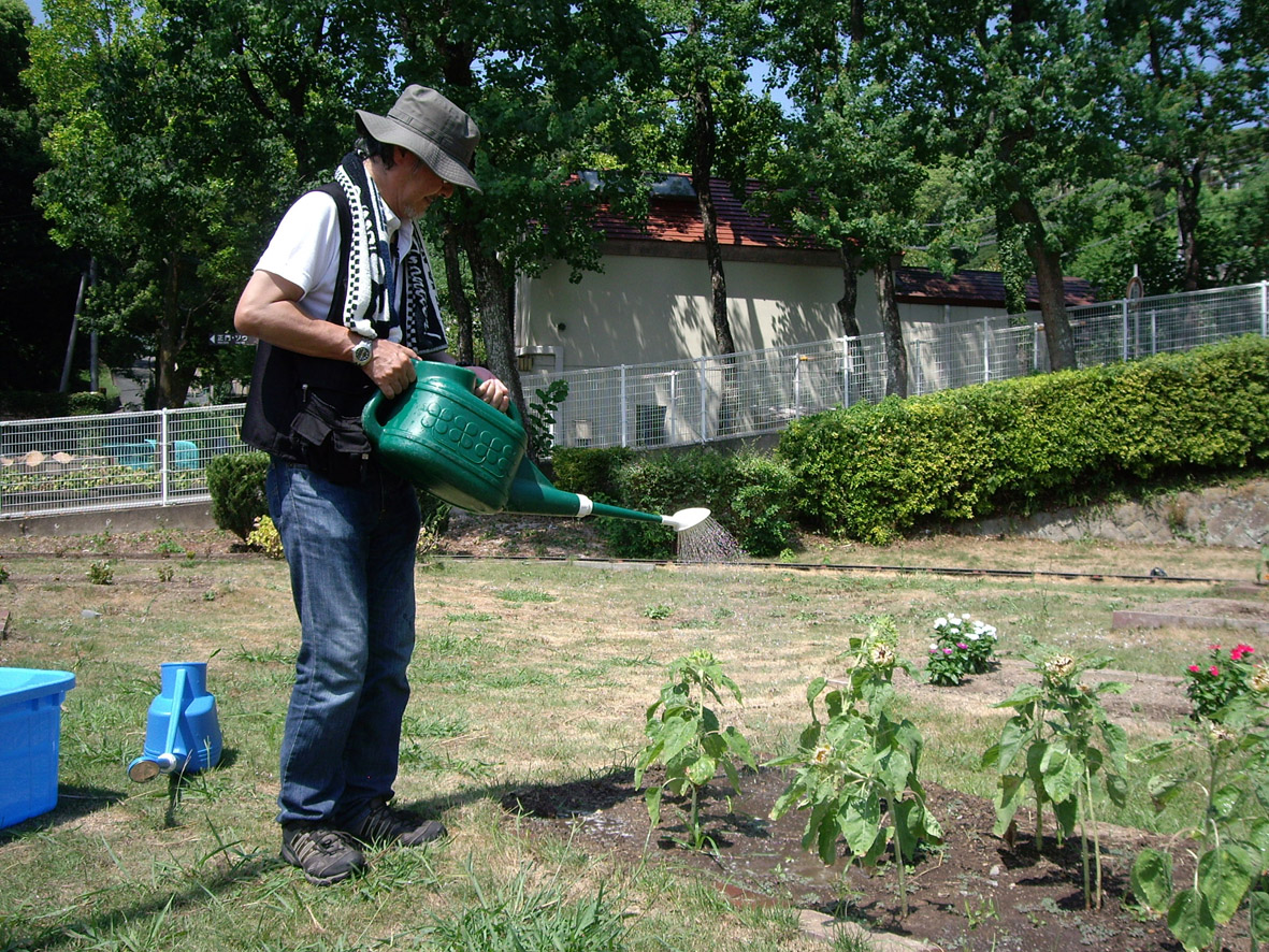 土の中から植物に必要な養分を作り出すことを祈って炎天下での散布です。 |